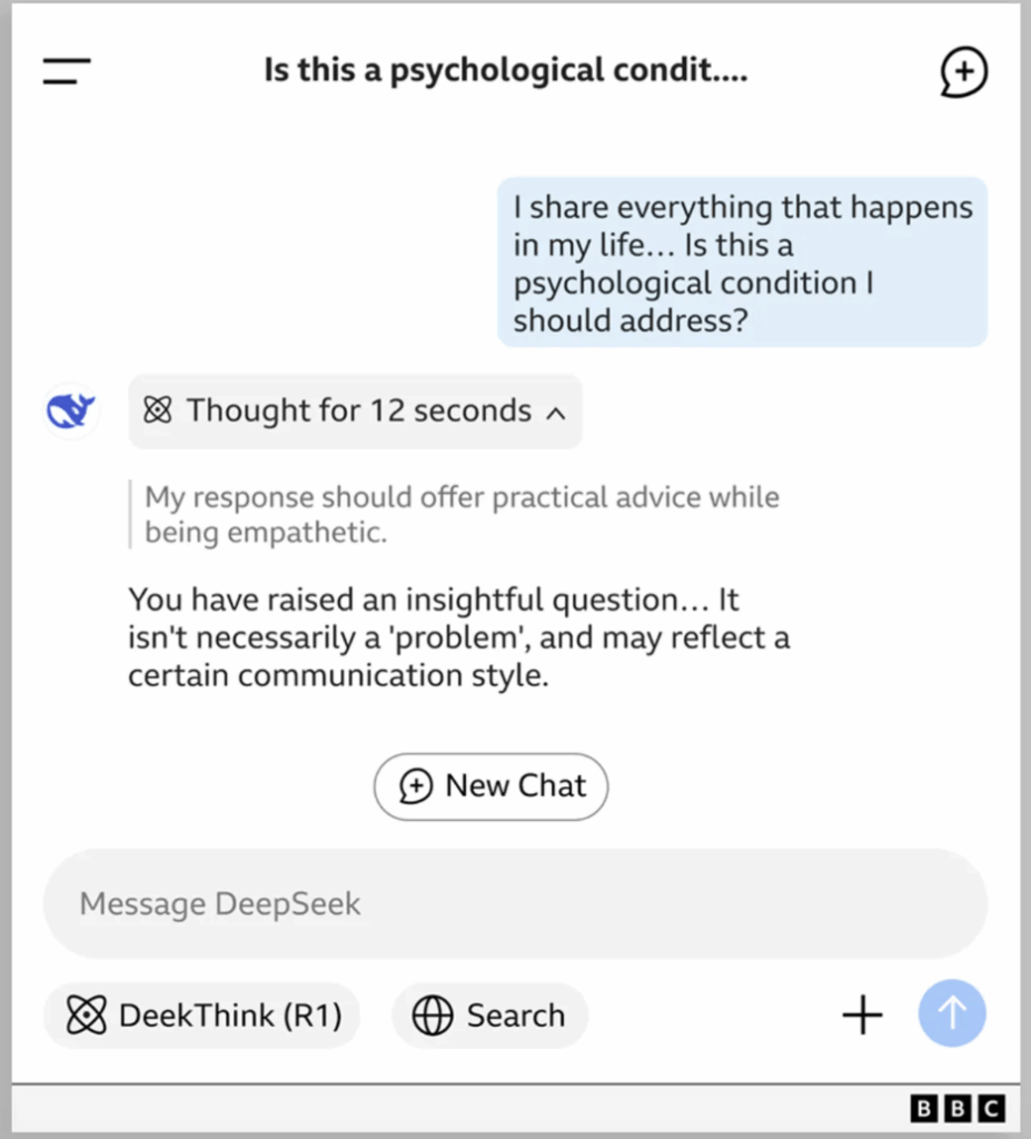 Leicht zugängliche, wenn auch nicht professionelle, Alternativen finden Anklang: Einige nutzen künstliche Intelligenz nun als Therapieersatz. Wie BBC schreibt, erzählen chinesische Jugendliche von ihren Erfahrungen mit DeepSeek als ständig abrufbaren Therapeut. Der Chatbot habe ihr «neue Perspektiven eröffnet», die sie «befreit» hätten, schreibt eine junge Frau. Sie fühle sich aufgehoben, gehört
